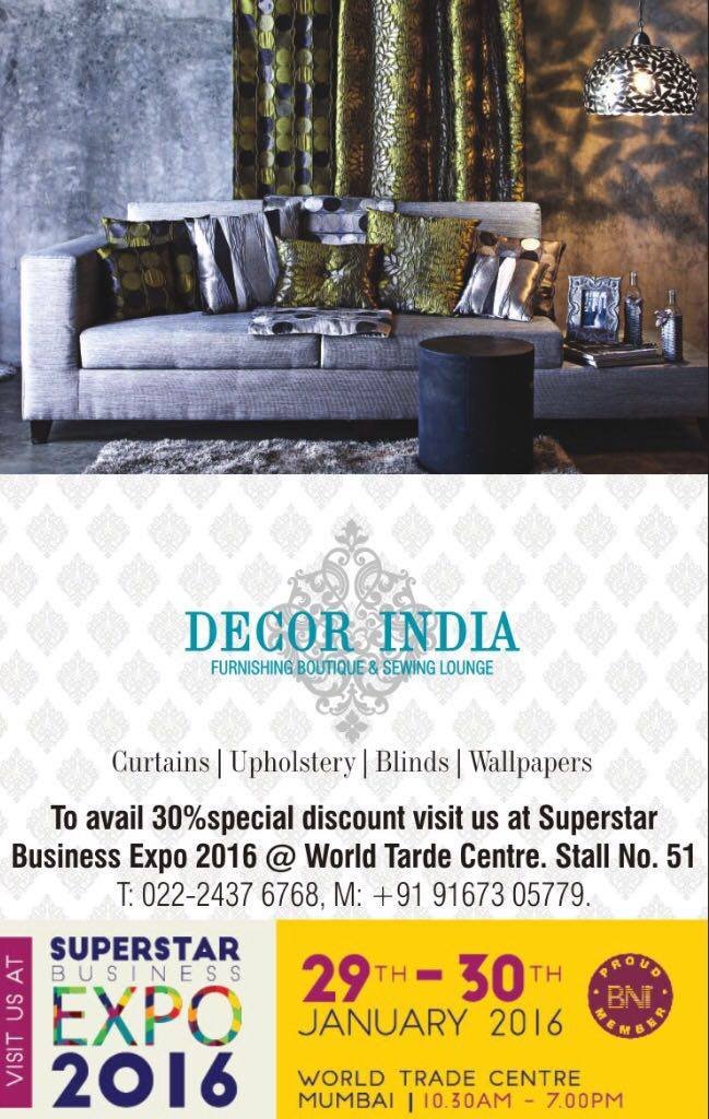 Have a glimpse of DecorIndia’s latest, beautiful, adorable furnishing collection at Stall no 51 at “BNI SUPERSTAR EXPO 2016, World Trade Center, Cuffe Parade.